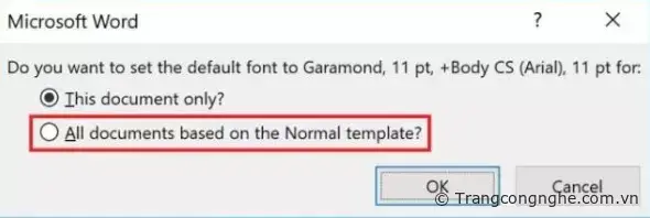 4. Word sẽ hỏi bạn liệu có muốn đặt font mặc định này cho tài liệu này hoặc tất cả văn bản khác trong tương lai. Hãy chọn All documents based on the Normal template, rồi click OK.