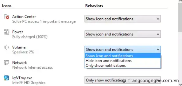 Nhấp vào mũi tên nhỏ ở góc phải thanh taskbar (trong hình trên là cạnh cái icon lá cờ) > Customize.... Trong cột bên trái bạn sẽ nhìn thấy các icon, chọn icon tương ứng với biểu tượng đã mất, sau đó trong cột bên phải tương ứng chọn Show icon and notifications. Tùy chọn này sẽ hiển thị icon cùng với các thông báo tương ứng. Nếu muốn ẩn icon nào, bạn chỉ cần chọn Hide icon and notifications.