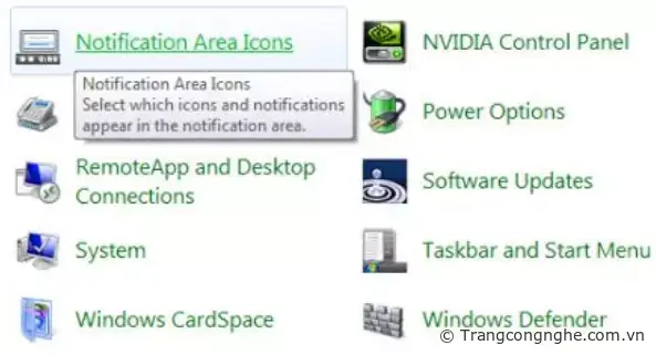 Đầu tiên, vào Start > chọn Control Panel > kích hoạt biểu tượng Noification Area Icons.