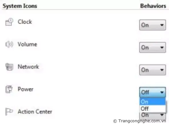 Sau đó, một cửa sổ mới sẽ xuất hiện, hiển thị danh sách các biểu tượng của hệ thống, như: Clock, Volume, Network, Power, Action Center,… ở phần System Icons. Còn ở phần Behavisors sẽ hiển thị trạng thái đang On/Off (tắt/mở) của biểu tượng tương ứng.