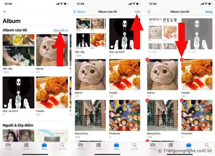 Để xóa Album, hãy vào Ảnh => Album => Xem tất cả => Sửa => ấn vào các dấu trừ màu đỏ để xóa Album.