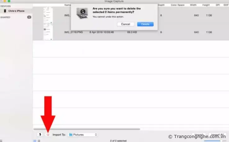 Bước 2: Để xóa tất cả, hãy nhấn Cmd + A trên bàn phím hoặc chọn ảnh muốn xóa bằng chuột, sau đó nhấp vào biểu tượng hình màu đỏ phía dưới bên trái màn hình => chọn Delete để xóa.