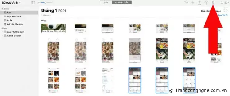 Bước 3: Chọn ảnh bạn muốn xóa, bạn có thể chọn nhiều ảnh bằng cách ấn giữ nút Shift trên bàn phím máy tính => sau khi chọn xong ấn vào biểu tượng hình thùng rác để xóa ảnh.