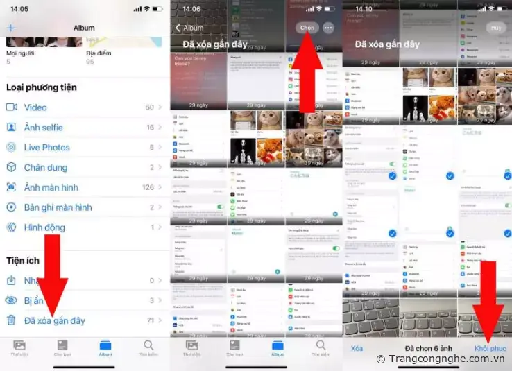 Như đã nói ở trên, thư mục đã xóa gần đây sẽ giúp bạn khôi phục lại ảnh nếu bạn lỡ xóa nhầm hình, để khôi phục lại bạn chỉ cần vào Ảnh => Album => Đã xóa gần đây => Chọn => hãy nhấp chọn vào ảnh mà bạn muốn khôi phục => ấn Khôi phục ảnh sẽ được phục hồi lại về máy.