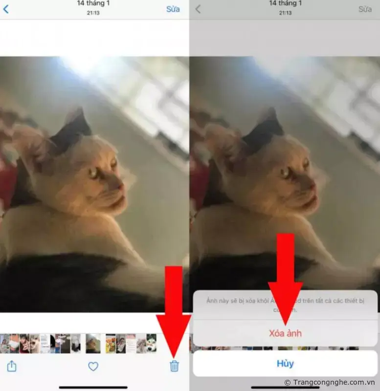 Đầu tiên, tôi sẽ hướng dẫn các bạn xóa ảnh theo cách thông thường đó là vào ứng dụng Ảnh => nhấp vào ảnh bạn muốn xóa => sau đó ấn vào biểu tượng hình thùng rác phía dưới bên phải màn hình => chọn Xóa ảnh.