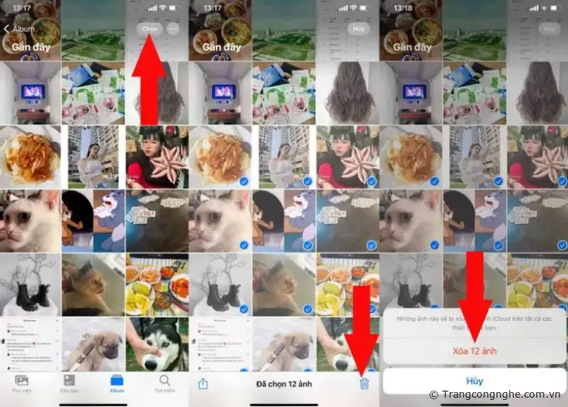 Để xóa hàng loạt ảnh trên iPhone cũng khá đơn giản, bạn chỉ cần vào ứng dụng Ảnh => ấn vào Chọn nằm ở trên cùng bên phải màn hình, sau đó tick chọn các hình ảnh mà bạn muốn xóa => ấn vào biểu tượng thùng rác và chọn Xóa ảnh.