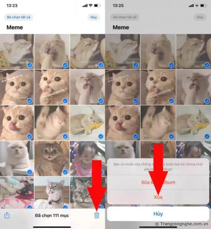 Bước 2: Giờ đây bạn chỉ cần ấn vào biểu tượng thùng rác => chọn Xóa để xóa tất cả các ảnh trong Album.