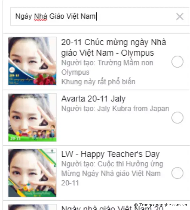 Bước 3: Tiếp đến nhìn xuống giao diện bên dưới, chúng ta sẽ nhập từ khóa Ngày Nhà Giáo Việt Nam vào thanh tìm kiếm. Ngay lập tức ở bên dưới sẽ xuất hiện các khung hình avatar theo đúng chủ đề 20 tháng 11 mà bạn cần tìn kiếm. Một số từ khóa mà bạn có thể tìm là 20 tháng 11 (không nhập 20/11 hay 20-11 vì không ra kết quả), nhà giáo, hoặc ngày nhà giáo, thầy cô.