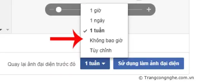 Bước 5: Khi đã hoàn thành xong việc điều chỉnh khung avatar chủ đề 20 tháng 11 trên Facebook, người dùng có thể chỉnh sửa thời gian sử dụng ảnh đại diện đó. Phần Quay lại ảnh đại diện trước đó có thể lựa chọn thời gian để quay về ảnh đại diện cũ. Facebook sẽ cho bạn thời hạn tối thiểu là 1 giờ và tối đa là 1 tuần, có thể là Không bao giờ. Trong trường hợp muốn chọn thời gian khác nhấn Tùy chỉnh.