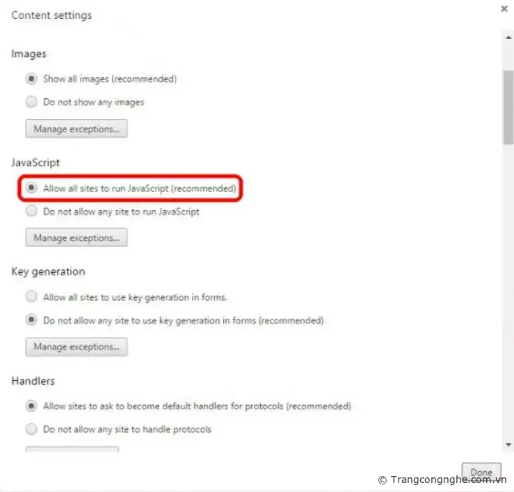 Các video trên YouTube không thể chạy được nếu jаvascript bị vô hiệu hóa, vậy nên bạn cần chắc chắn rằng jаvascript đã được bật lên. Hãy vào Chrome Settings và click vào Show advanced settings. Trong phần Privacy, click Content Settings. Tìm đến jаvascript và chọn Allow all sites to run jаvascript và click Done.