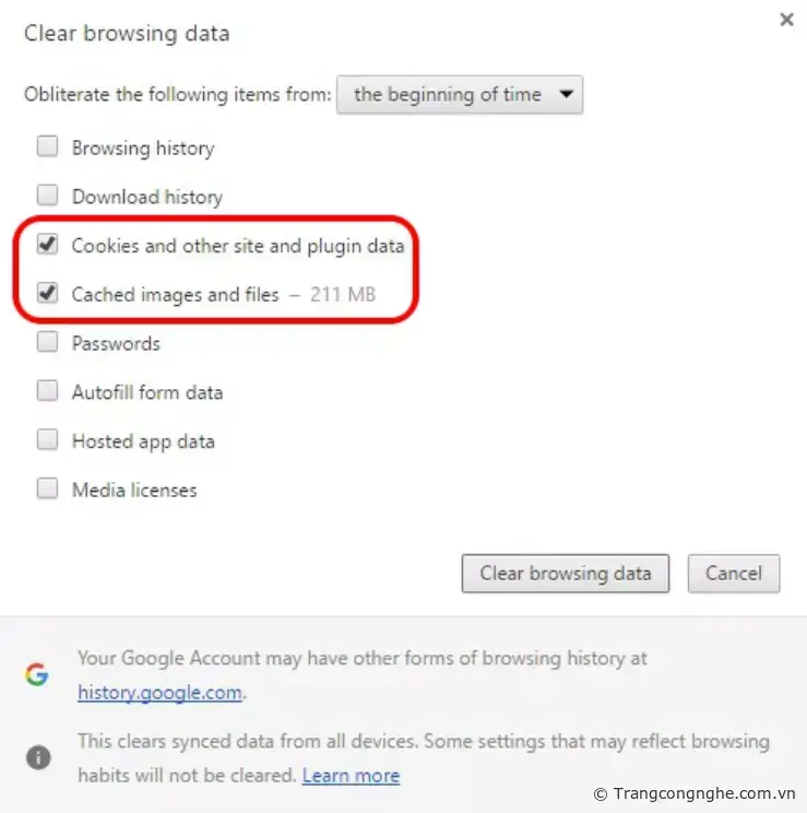 Nếu chạy video YouTube trong chế độ duyệt ẩn danh hoặc bị nhúng vào một trang web, bạn cần phải xóa cache và cookies để sửa các lỗi. Để xóa cache và cookies hãy nhấn tổ hợp phím tắt Ctrl+Shift+Delete. Trong trang Clear browsing data, tích chọn các mục cache và cookies, sau đó click vào Clear browsing data.