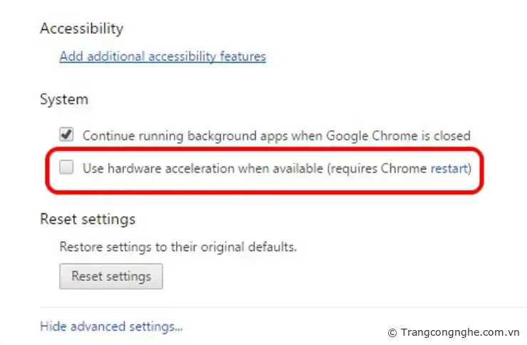 Bên cạnh cách thứ 3, đây cũng là một cách mang đậm tính 'ảo lòi, huyền bí' đáng để thử lắm! Vào Chrome Settings > Show advanced settings, cuốn xuống mục System. Ở đây, bỏ tích Use hardware acceleration when available.