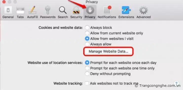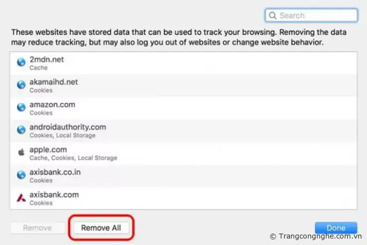 Nếu bạn đang sử dụng Mac và bị lỗi xem YouTube trên trình duyệt web Safari, hãy thử xóa cookies và dữ liệu duyệt web để thử xem nhé! Đó là cách duy nhất có thể thực hiện được trên Safari. Để xóa, hãy truy cập vào Safari Preference, vào tab Privacy và nhấn vào Manage Website Data. Trong cửa sổ hiện lên tiếp theo, hãy click vào Remove All.