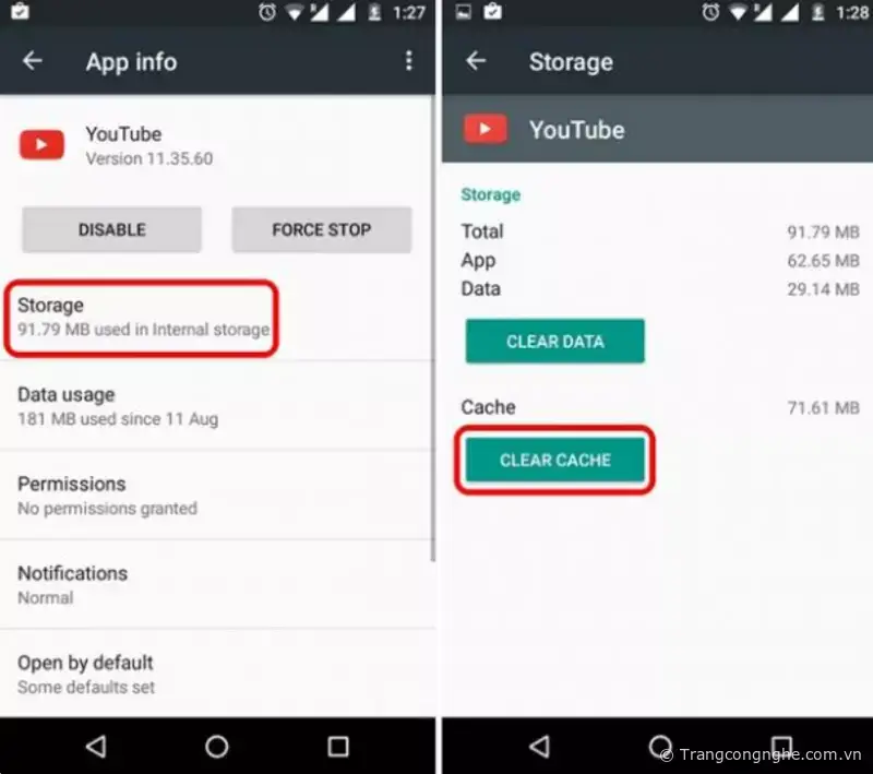 Với việc xóa cache, bạn có thể khắc phục hầu hết các lỗi chơi video trên ứng dụng YouTube. Để xóa cache, hãy vào Settings > Apps > YouTube và trong phần thông tin của YouTube, chạm vào mục Storage. Ở đây, hãy nhấn vào Clear Cache.