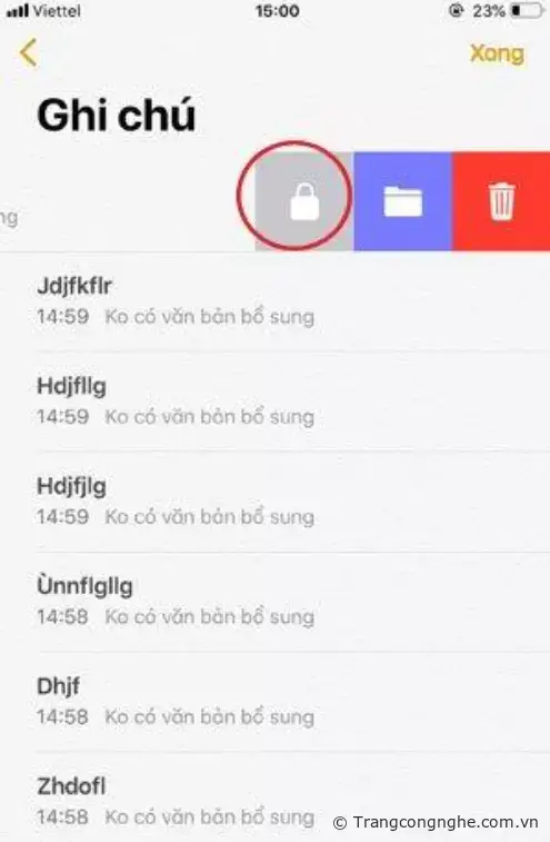 Tại giao diện quản lý các file ghi chú hãy chạm lướt từ phải qua trái, lúc này sẽ có các lựa chọn xuất hiện hãy nhấn chọn biểu tượng chiếc khóa.