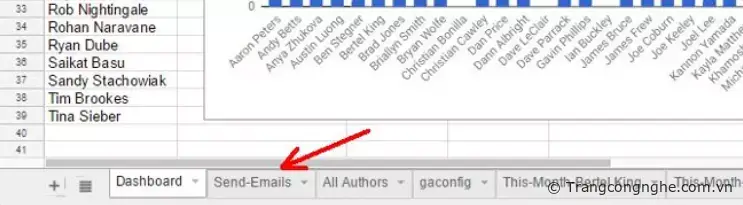 Bước đầu tiên là thiết lập một trang tính gồm tên, địa chỉ email và tin nhắn đến những người mà bạn muốn gửi email. Ví dụ, bạn tạo một bảng tin để tự động nhập tất cả các bài báo được xuất bản trong tháng từ công cụ Google Analytics. Sau đó tạo một trang tính 'All Authors' đã tổng hợp các bài báo được xuất bản cho mỗi tác giả, và bây giờ gửi cho mỗi tác giả một email với số lượng bài báo của họ. Để bắt đầu, tạo trang tính email đặc biệt của bạn bằng cách thêm một trang tính mới vào bảng tính hiện tại và đặt tên cho nó là 'Send emails' (Gửi email).