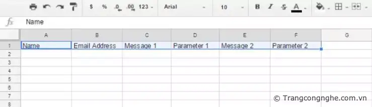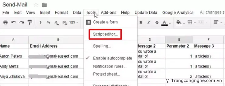 Trong trang Send emails mới này, bạn sẽ tạo tiêu đề. Mỗi hàng trong bảng tính này sẽ đại diện cho một email cá nhân sẽ được gửi đi. Trong ví dụ trên, tranh tính gồm tên người nhận, địa chỉ email và tin nhắn đặt bên trong script.