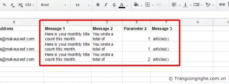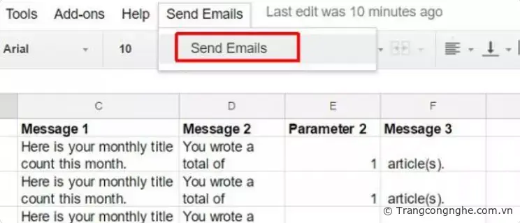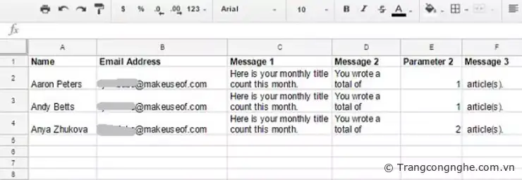 var rowData = data[i]; var emailAddress = rowData[1]; var recipient = rowData[0]; var message1 = rowData[2]; var message2 = rowData[3]; var parameter2 = rowData[4]; var message3 = rowData[5];[/code] Như bạn thấy ở trên, các phần tử cột được kéo vào mảng một chiều được gọi là rowData. Sau đó, chuyển đến cột thứ hai (để lấy địa chỉ email) bằng cách tham chiếu rowData [1], phần tử thứ hai của mảng (phần tử đầu tiên của mảng luôn luôn là số không). Bước tiếp theo là gộp lại tất cả các phân đoạn của tin nhắn thành nội dung của email. Bạn có thể chỉnh sửa format nội dung email bằng cách sử dụng ký tự n để quay về đầu dòng. Đây là dòng code ghép các phân đoạn tin nhắn: