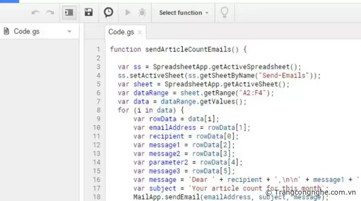 function sendArticleCountEmails() { var ss = SpreadsheetApp.getActiveSpreadsheet(); ss.setActiveSheet(ss.getSheetByName('Send-Emails')); var sheet = SpreadsheetApp.getActiveSheet(); var dataRange = sheet.getRange('A2:F4'); var data = dataRange.getValues(); for (i in data) { var rowData = data[i]; var emailAddress = rowData[1]; var recipient = rowData[0]; var message1 = rowData[2]; var message2 = rowData[3]; var parameter2 = rowData[4]; var message3 = rowData[5]; var message = 'Dear ' + recipient + ',nn' + message1 + ' ' + message2 + ' ' + parameter2 + ' ' + message3; var subject = 'Your article count for this month'; MailApp.sendEmail(emailAddress, subject, message); } }[/code] Script này có vẻ khá phức tạp, nhưng thực sự không phải toàn bộ. Hãy “mổ xẻ” nó để biết chính xác mỗi dòng viết gì.