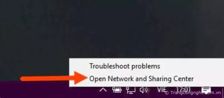 Bước 1: Việc đầu tiên bạn cần làm là click chuột phải vào biểu tượng trên thanh Taskbar sau đó nhấn vào Open Network and Sharing Center