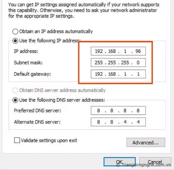 Lưu ý tại dòng IP adress 192.168.1.96 thì giá trị 96 bạn có thể thay đổi từ 1 đến 250 miễn sao truy cập được vào mạng, nên để số to sẽ tránh được tình trạng trùng IP.