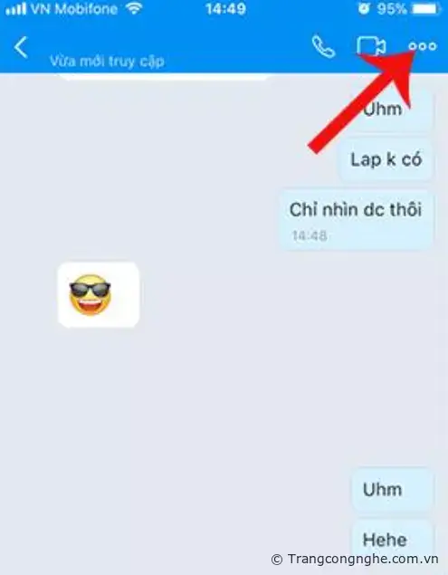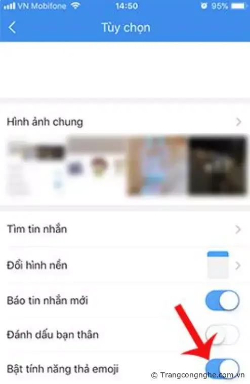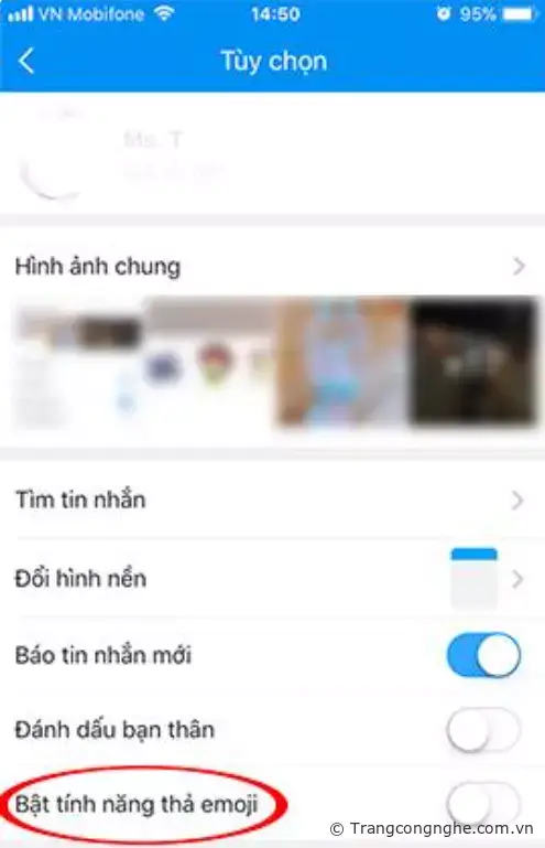 Bước 2: Từ cửa sổ chat, chạm vào biểu tượng ba dấu chấm ở góc trên, bên phải màn hình, sau đó tìm và kích hoạt tính năng 'Bật tính năng thả emoji' lên.