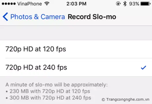Bước 5: Đối với video chuyển động chậm, chỉ có hai lựa chọn: 720p HD at 120 fps (230MB mỗi phút) và 720p HD at 240 fps (mặc định thiết lập là 300MB mỗi phút).