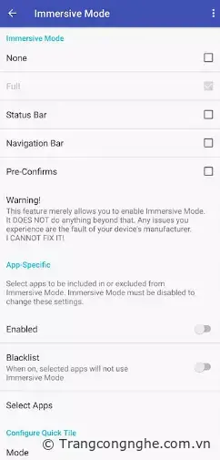 Sau khi hoàn tất, hãy mở SystemUI Tuner lên, vào mục Immersive Mode, tại đây, bạn sẽ thấy cái tuỳ chọn cho ẩn Status bar và navigation bar.