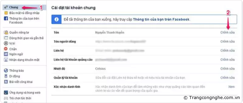 Bước 2: Chọn mục Chung trong bảng hiển thị bên trái màn hình, sau đó nhấp vào chữ Chỉnh sửa bên phải của mục Tên.