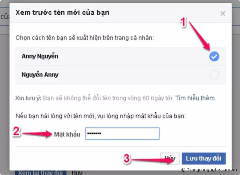 Bước 4: Chọn tên bạn muốn đổi trong phần Chọn cách tên bạn sẽ xuất hiện trên trang cá nhân và tích vào vòng tròn bên phải của tên đó. Cuối cùng nhập mật khẩu và chọn Lưu thay đổi.
