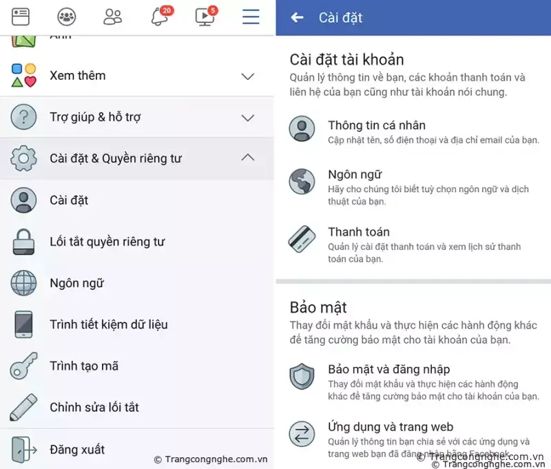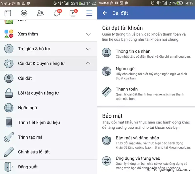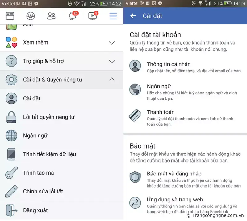 Bước 1: Nhấn nút 3 gạch bên phải phía trên của ứng dụng Facebook, chọn mục Cài đặt & quyền riêng tư, sau đó chọn Cài đặt.