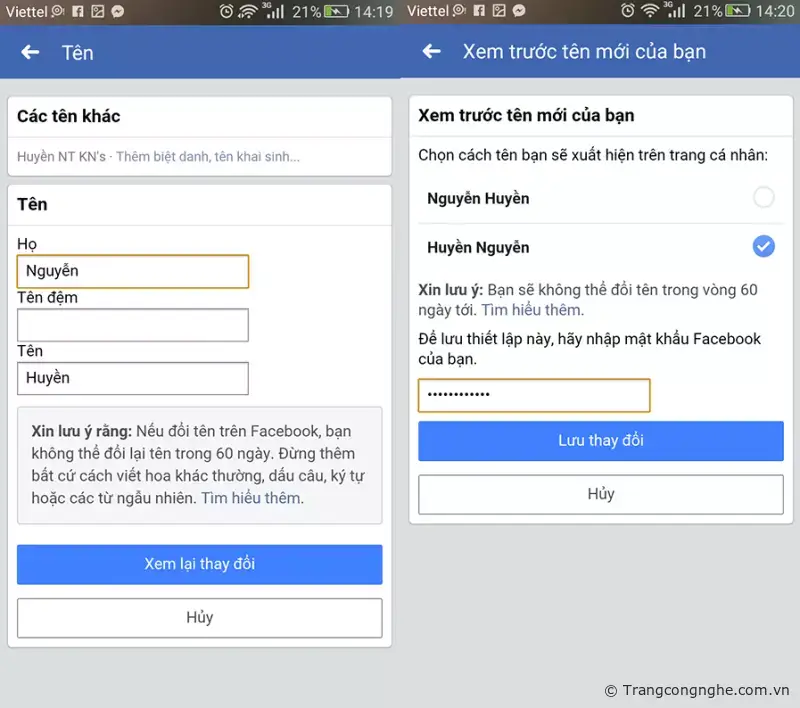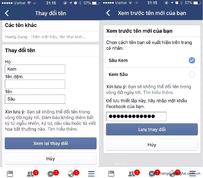 Bước 3: Nhập tên Facebook muốn đổi vào ô Họ, Tên, Tên đệm rồi chọn ô Xem lại thay đổi.