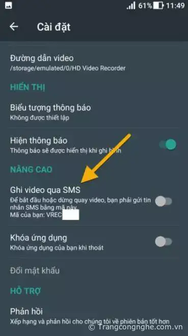 - Quay bằng cách kích hoạt SMS: Bạn có thể quay video từ xa bằng cách gửi tin nhắn vào điện thoại với mã ứng dụng cung cấp. Bấm nút bánh răng > duyệt tới Ghi video qua SMS để kích hoạt và lấy mã quay. Thí dụ: VREC 1234