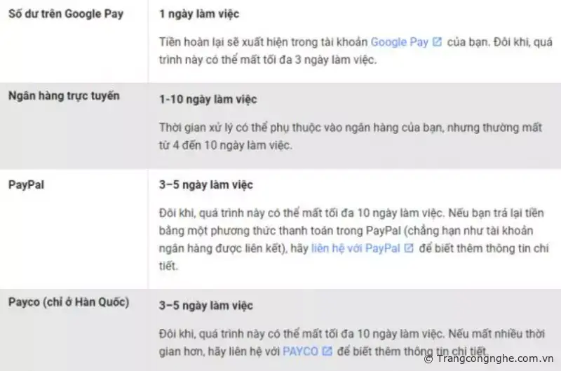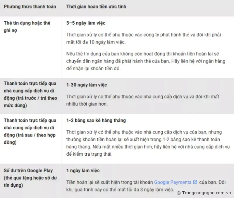 Ngoài ra, Google không hoàn tiền cho tất cả các mặt hàng trên Google Play và tùy thuộc vào nhiều yếu tố khách quan như thiết lập từ nhà phát triển, vị trí địa lý, phương thức thanh toán, điều kiện hoàn trả vv... Nếu yêu cầu hoàn tiền của bạn được chấp nhận hãy thường xuyên kiểm tra số dư trong tài khoản thanh toán!