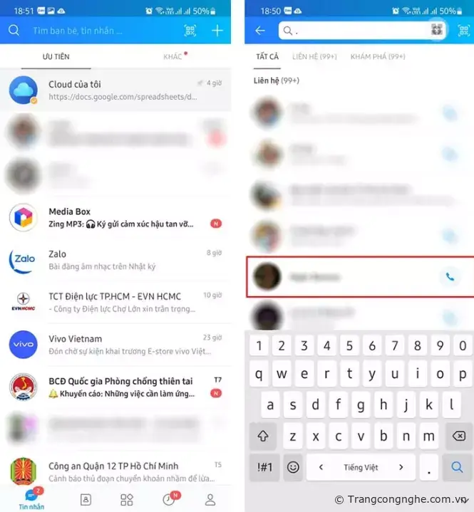 Bước 1. Tại thanh Tìm kiếm tin nhắn Zalo, bạn nhập dấu chấm '.' vào. Zalo sẽ hiển thị tất cả các tài khoản, bao gồm cả tài khoản tin nhắn bị ẩn.