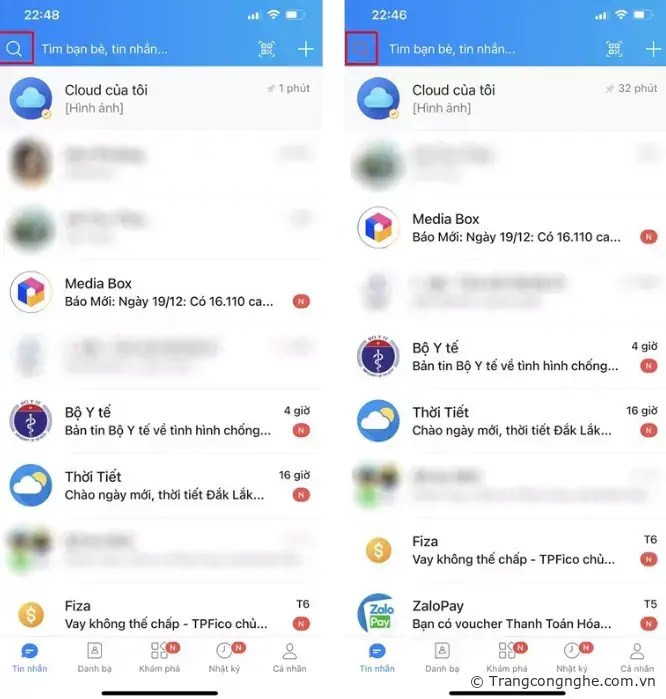 Khi có thông báo tin nhắn ẩn trên Zalo thì biểu tượng kính lúp sẽ hiển thị màu đỏ thay vì màu trắng như bình thường.