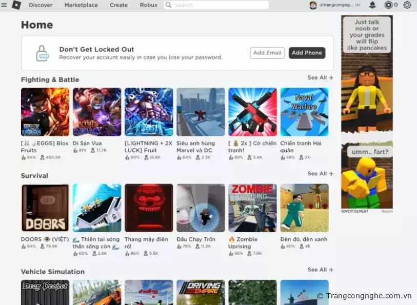 B2 : Sau khi đăng ký thành công bạn sẽ được chuyển tới giao diện chính của Roblox với hàng triệu game khác nhau
