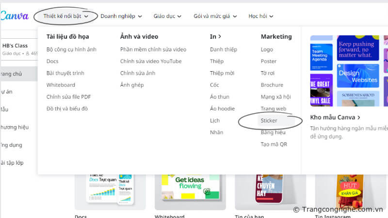 Bước 2: Tại trang chủ, chọn Thiết kế nổi bật > Marketing > chọn Sticker.