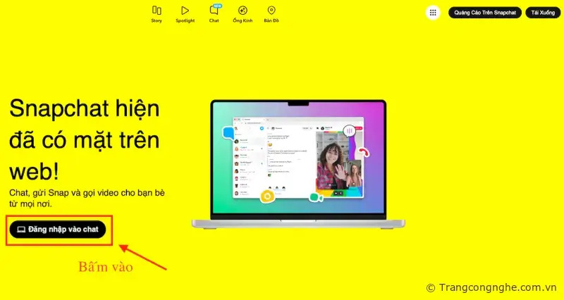 B1 : Trước tiên hãy đăng nhập trực tiếp Website chính thức của Snapchat https://www.snapchat.com/ sau đó lựa chọn ấn vào nút "Đăng nhập vào chat" (Tất nhiên trước khi vào chat bạn cần phải có tài khoản để tiếp tục sử dụng, chúng tôi sẽ hướng dẫn đăng ký tài khoản hướng dẫn dưới)