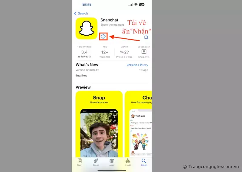 B1: Bạn có thể truuy cập trực tiếp vào chợ ứng dụng của App Store qua đường dẫn sau https://apps.apple.com/us/app/snapchat/id447188370 tiếp tục chọn nút "Nhận" để tiến hành tải về