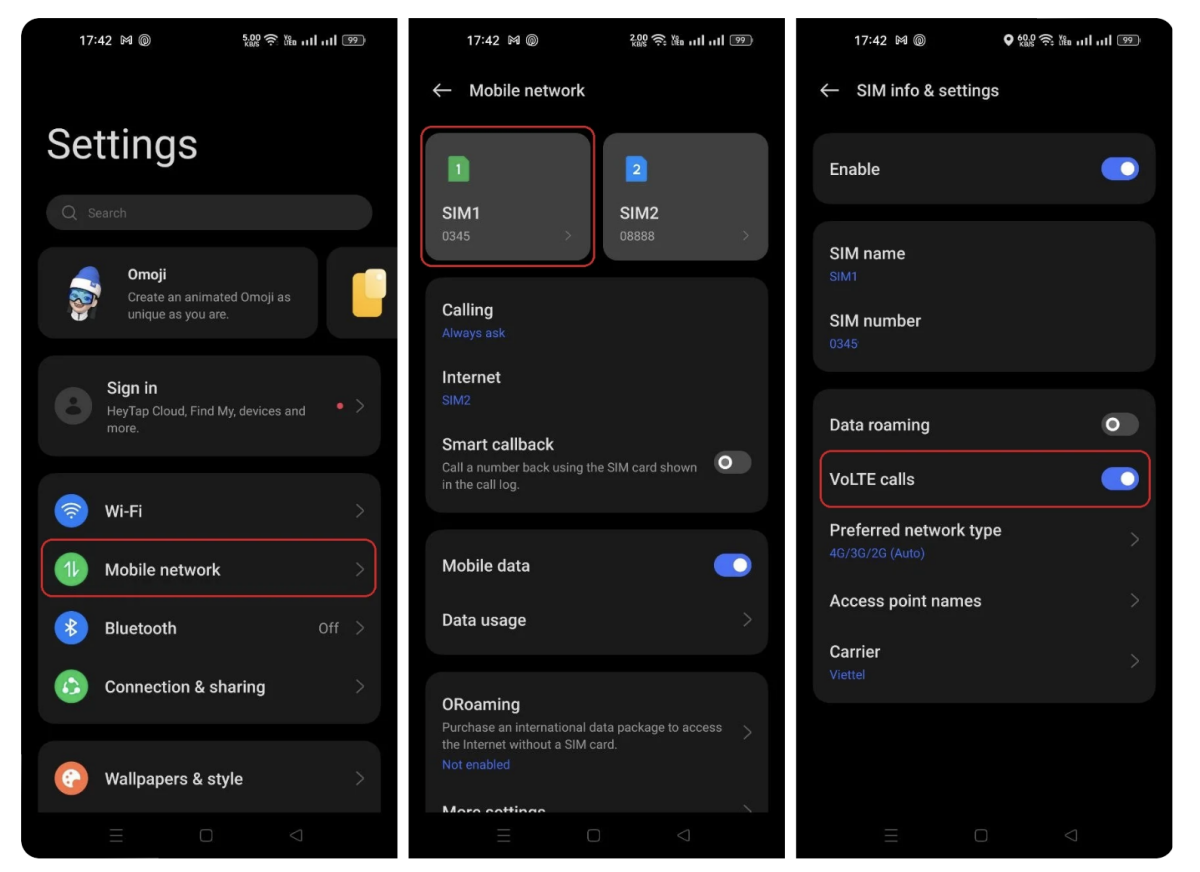 Có hai cách chính để kích hoạt tính năng VoLTE. Thứ nhất là thông qua việc nhắn tin theo cú pháp do nhà mạng cung cấp, chẳng hạn “VOLTE on” gửi 8868 (Viettel). Cách thứ hai là vào cài đặt trên điện thoại, chọn tùy chọn Mạng di động => Tùy chọn sim => VoLTE để bật tính năng này.
