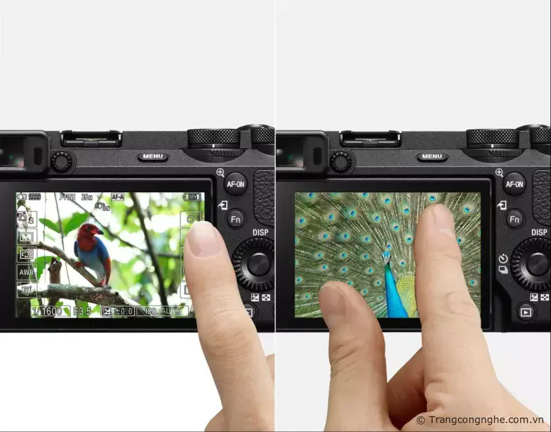 Màn hình 3 inch của Sony A6700 đã được nâng cấp lên độ phân giải 1,03 triệu điểm ảnh và tích hợp cảm ứng. Giao diện trên màn hình này giống hệt với ZV-E1 và Sony ZV-1 II mới, tạo sự dễ sử dụng, trực quan và đẹp mắt. Tôi rất thích giao diện này. Ngoài ra, đầu nhìn trực tiếp (EVF) của máy cũng được nâng cấp với bàn hình OLED 2.36 triệu điểm ảnh và độ phóng đại 1,07x.