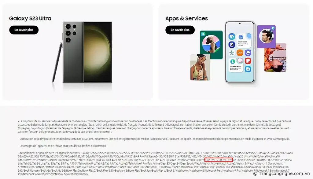 Mới đây, trên trang chủ giới thiệu trợ lý ảo Bixby của mình, Samsung vô tình liệt kê Tab S9 FE và Tab S9 FE+ vào danh sách được hỗ trợ bên cạnh các sản phẩm khác như Tab S9/Tab S9+/Tab S9 Ultra.