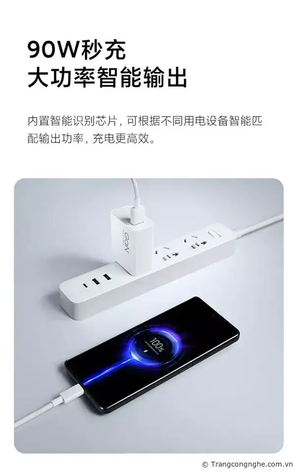 Bộ sạc của Xiaomi bán ra có kèm dây sạc Type - C với độ dài 100 cm và được trang bị chip nhận dạng thông minh. Con chip này cho phép bộ sạc tự động điều chỉnh công suất đầu ra, đáp ứng các yêu cầu nạp năng lượng cho các thiết bị khác nhau.