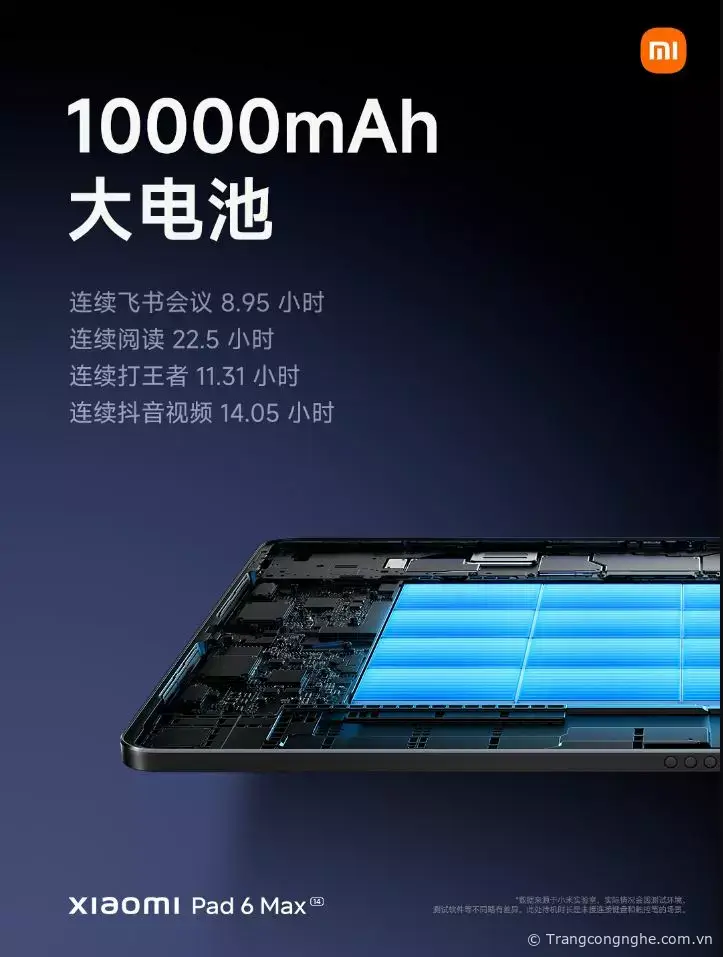 Xiaomi Pad 6 Max tiếp tục khẳng định sự cao cấp của mình không chỉ thông qua màn hình và hiệu suất mạnh mẽ mà còn bởi dung lượng pin khủng, khả năng sạc nhanh ấn tượng và tính năng sạc ngược tiện lợi.