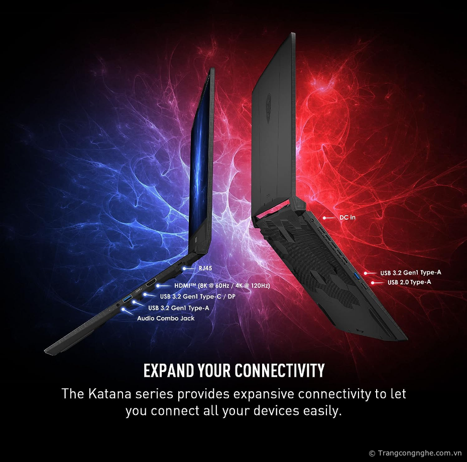 Về cổng kết nối, Katana 15 được trang bị đầy đủ. Tuy nhiên, MSI đã làm thiếu một cổng Thunderbolt 4, điều này có nghĩa là không có cách nào kết nối một hệ thống GPU bên ngoài trong tương lai.