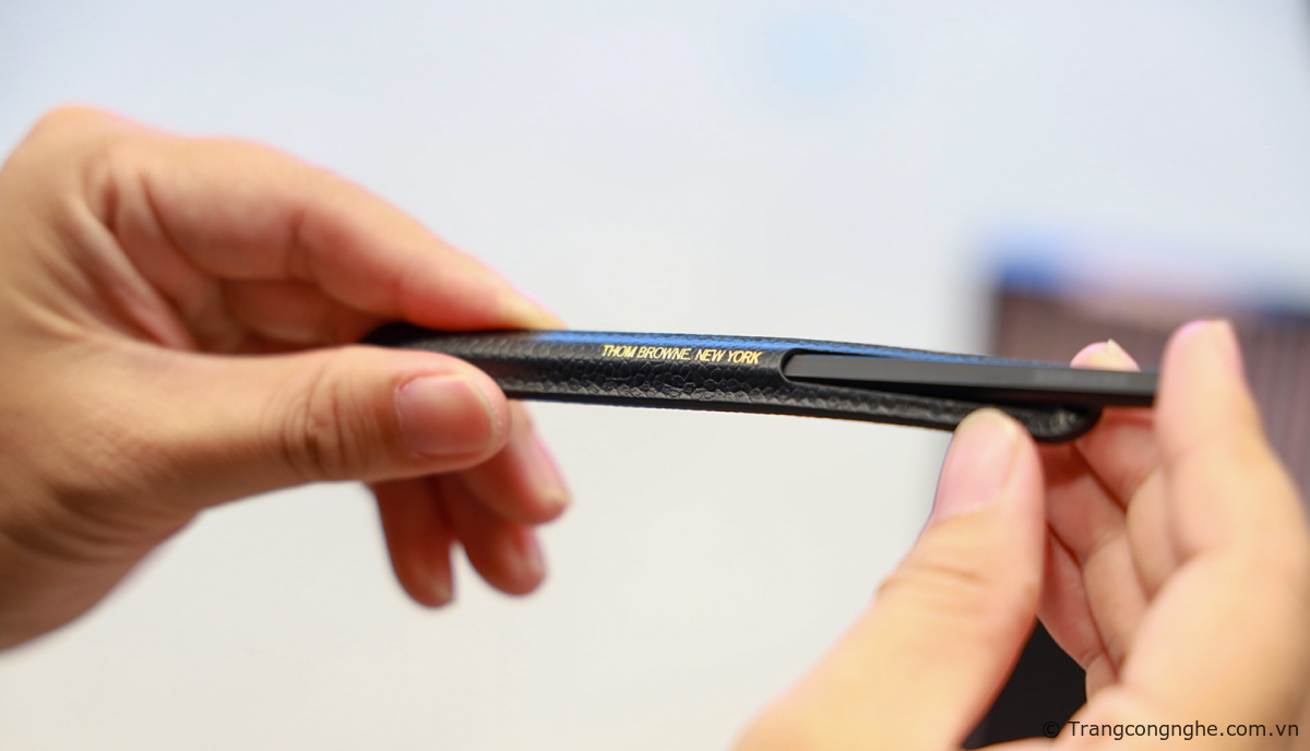 Phiên bản Galaxy Z Fold5 Thom Browne Edition đi kèm với một chiếc bút S Pen được đựng trong một chiếc bao da nhỏ riêng. Tuy nhiên, người dùng cũng có thể gắn S Pen trực tiếp lên mặt lưng của máy bằng cách sử dụng hai chiếc ốp da đi kèm. Những ốp da này có bề mặt sần và có một móc vải nhỏ ở phía bên phải để gắn bút vào.