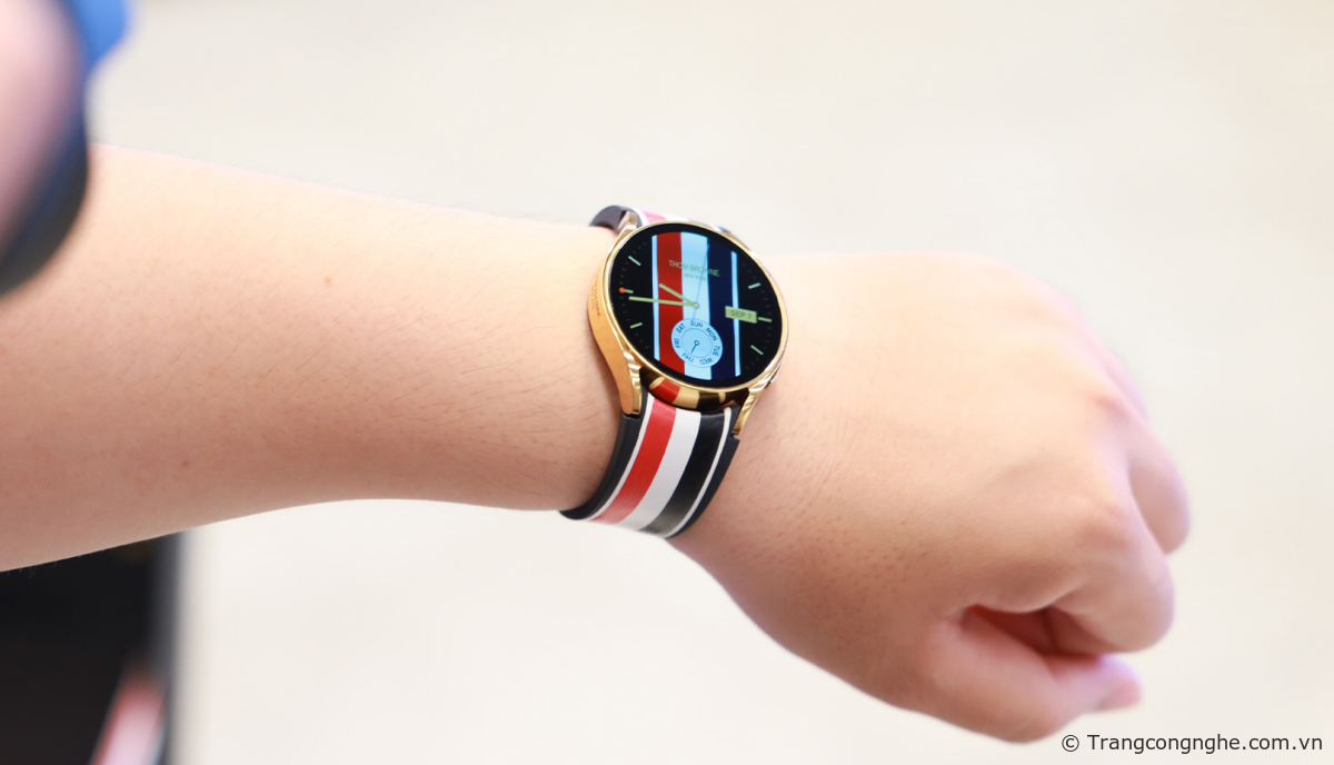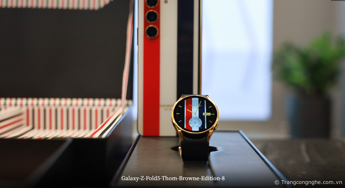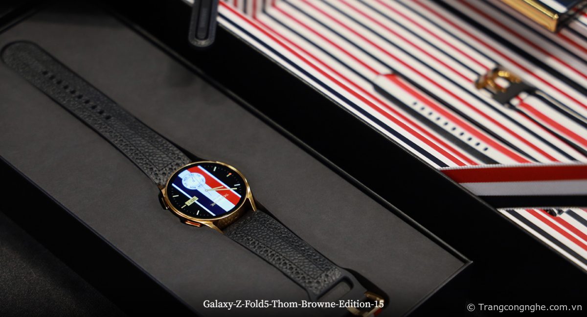 Trong bộ sưu tập Thom Browne lần này, ngoài Galaxy Z Fold5, còn có sự xuất hiện của Galaxy Watch6. Điểm đặc biệt của phiên bản Thom Browne Edition là khung của chiếc đồng hồ được thiết kế màu vàng và có logo Thom Browne được khắc ngay bên cạnh. Galaxy Watch6 Thom Browne Edition đi kèm với hai mẫu dây đeo đặc trưng. Một mẫu là dây đeo da sỏi đen với các chi tiết brogue tinh tế, và một mẫu khác là dây đeo màu sọc grosgrain cổ điển trên nền da trơn.