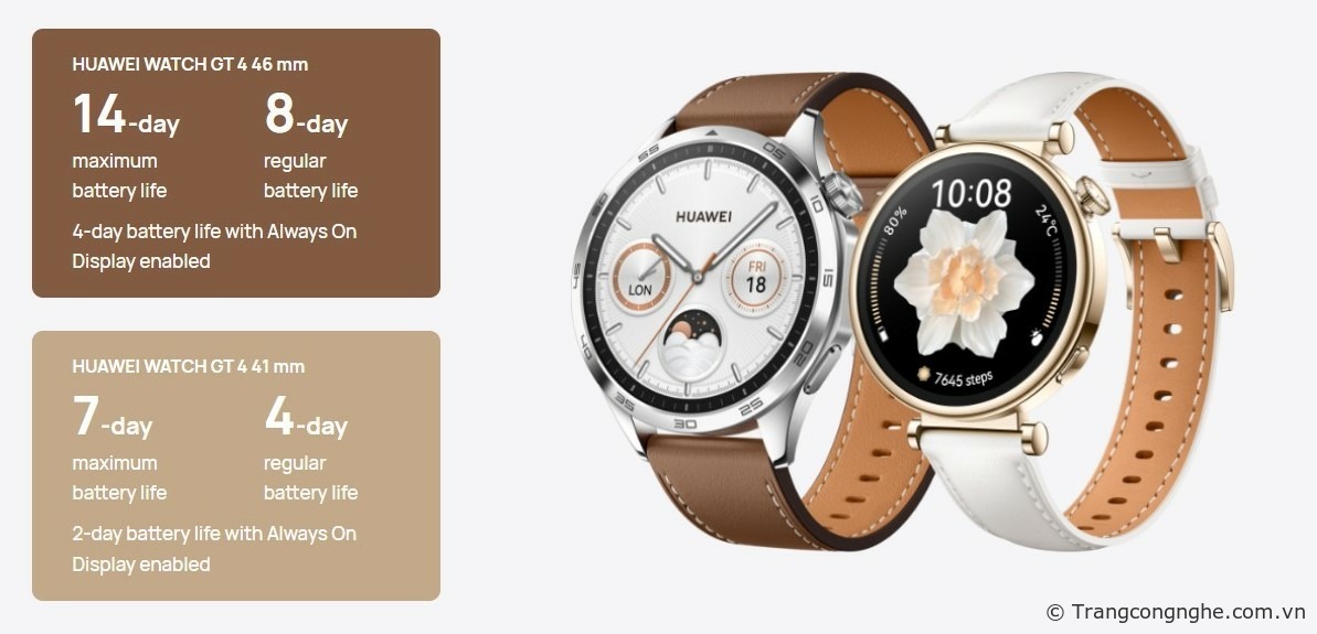 Theo GSMArena, các tùy chọn kích cỡ sẽ có thời lượng pin khác nhau với chênh lệch lớn, trong khi phiên bản 46mm cung cấp thời lượng sử dụng lên tới 14 ngày thì với kích cỡ 41mm người dùng chỉ có thể sử dụng trong 7 ngày trước khi thiết bị cần được sạc lại. Cả hai sản phẩm được cải thiện thời lượng pin lên 20% so với GT3, và đi kèm với chế độ Always-On Display được cải tiến – nó có thể hiển thị nhiều thông tin hơn tới 20% so với trước đây.