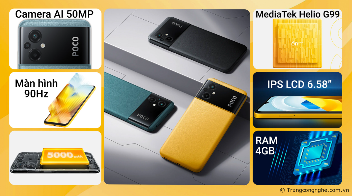 Với hệ thống camera sau gồm 3 ống kính, bao gồm một camera chính 50MP và hai camera phụ 2MP, POCO M5 cho phép người dùng chụp ảnh chất lượng cao, mang lại sự sắc nét và chân thực cho hình ảnh.